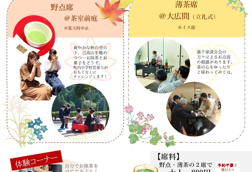 今年も「己高庵 秋の茶会」を開催いたします。このお茶会は平成9年の茶室建設時より、日本の伝統文化である「茶道」を通して子どもたちの健全育成と地域の振興を図ることを目的に約30年にわたり開催されています。年齢や服装などの...