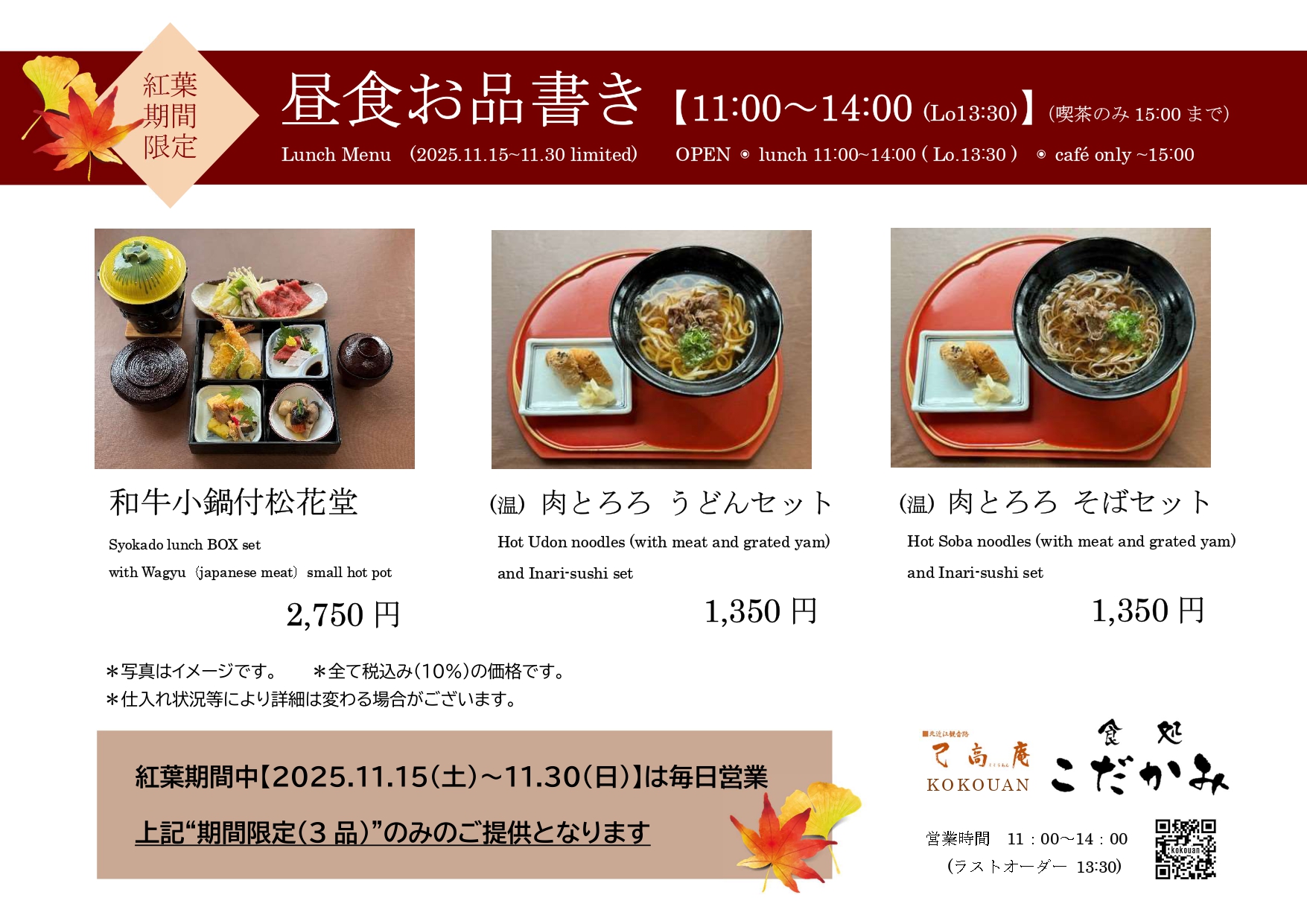 ◉2025(令和7年)鶏足寺・石道寺 紅葉期間中の食事処「こだかみ」(レストラン)の営業について